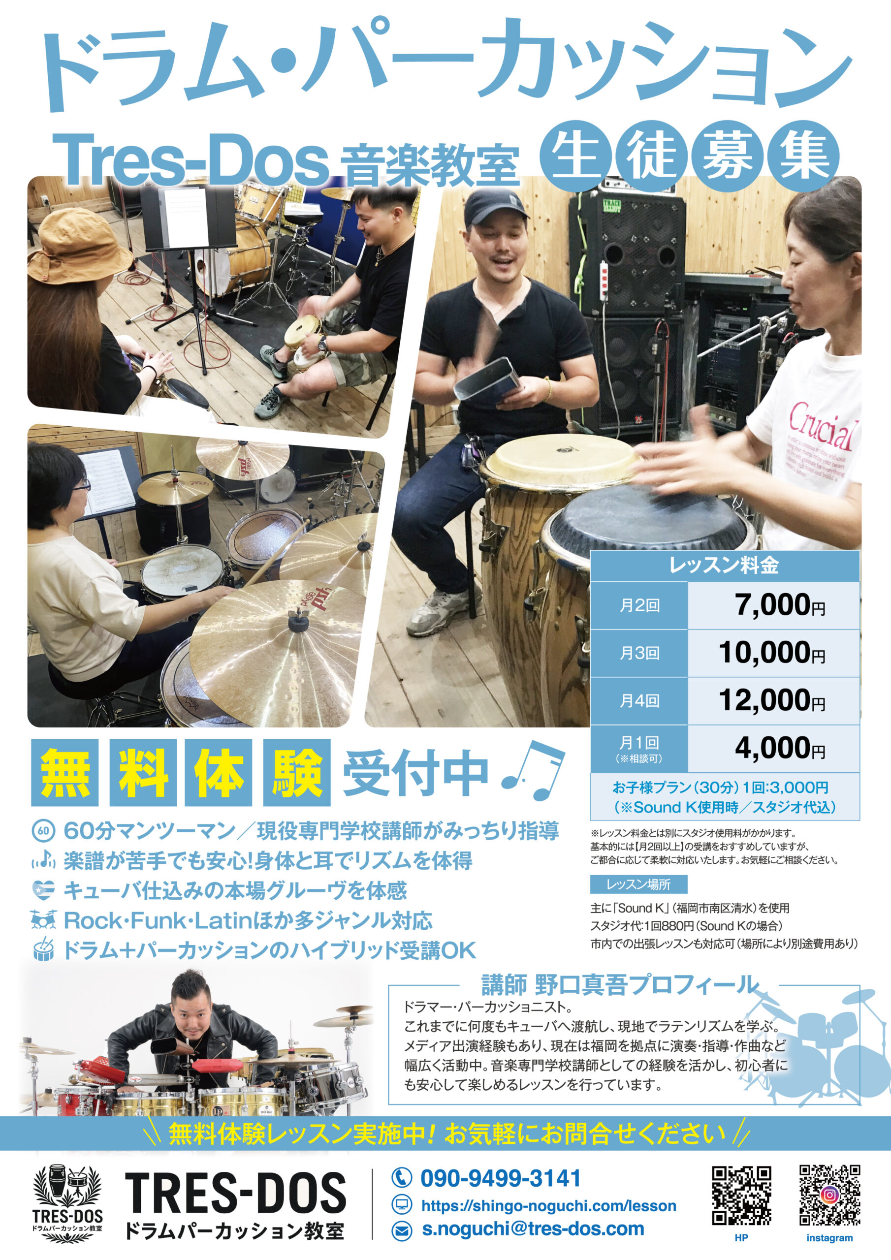 普段ドラムしか叩かない方でも色々なパーカッションのパターンを知ることでドラムセットに応用できオンリーワンのドラマーになれるヒントをつかめるかもしれません!これを機にラテンパーカッションを始めてみませんか?