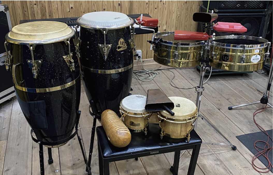 ドラムセット、ティンバレス、コンガ、ボンゴ、ギロ、マラカス など